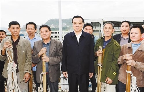 李克强来到轮船甲板上,认真观察港口基础设施和航道建设情况,与有关部委负责人共商长江黄金水道未来发展大计。他说,长江黄金水道是贯通东中西部、通航能力最强的航道,要用黄金水道串起长江经济带“珍珠链”。